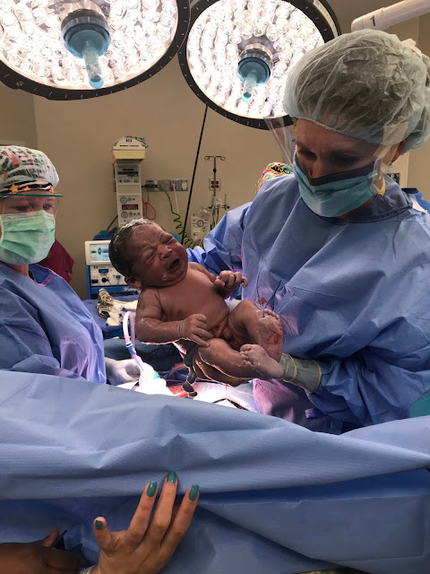 The actual surgery went very well. It's also fast. I was in there being prepped a little before 10 a.m. & Here he is at 10:20 a.m. I had an awesome team in the OR. They had me very relaxed & confident. Especially the Anesthesiologist. I was beyond nervous about the spinal tap, while she was prepping me all I was doing was praying. That needle in my lower back to numb me was NO FUN! But I got through it, and she was just amazing, she even took our pictures for us! I loved that they lowered the drape so that I could see him, they actually offered to lower so I could watch him being born, but I was not too keen on the idea of watching their hands inside my body, pulling him out! I feel like I would have nightmares! My hubby on the other hand watched every single thing they did to me. I was happy just to see the above.